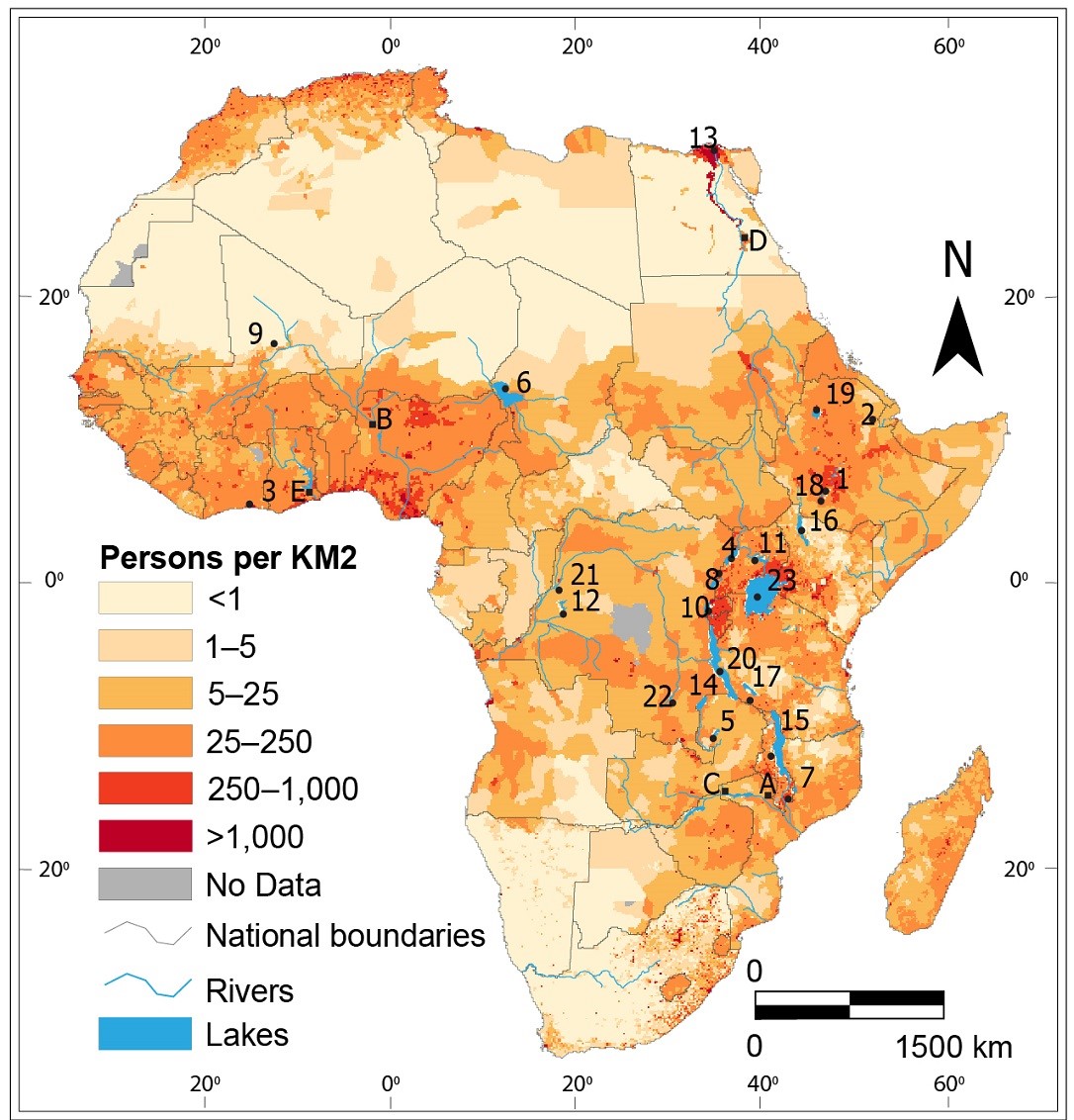 Map of Africa with lakes and population density based on the UN world population map for 2016. The names of the lakes are as in the Table of physical features of the lakes